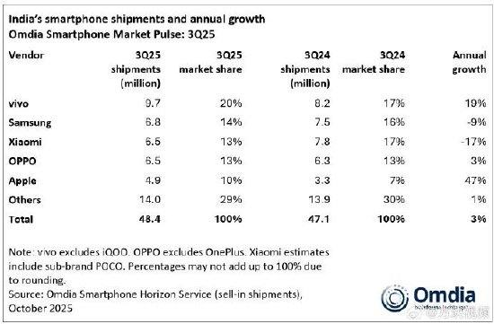 Omdia最新报告揭示,2025年第三季度印度智能手机市场出货量攀升至4840万台,同比增长3%,在此期间,vivo(不含iQOO品牌)以970万台的成绩稳坐市场销售冠军宝座,市场份额高达20%,紧随其后的是三星,以680万台出货量和14%的市场份额位居第二,小米和OPPO(不含一加)出货量相当,均以650万台的成绩排名第三,苹果凭借来自低线城市的增长需求,出货量达到490万台,刷新了其在印度市场的季度最高出货记录。
